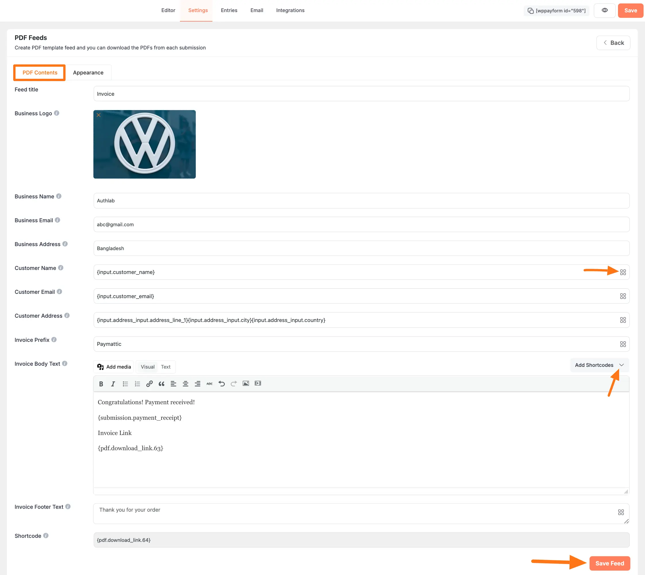Now you will see the customization options for your chosen PDF Template Feed. You can add your business information customer information, invoice body, and a lot of fields for PDF feed customization.