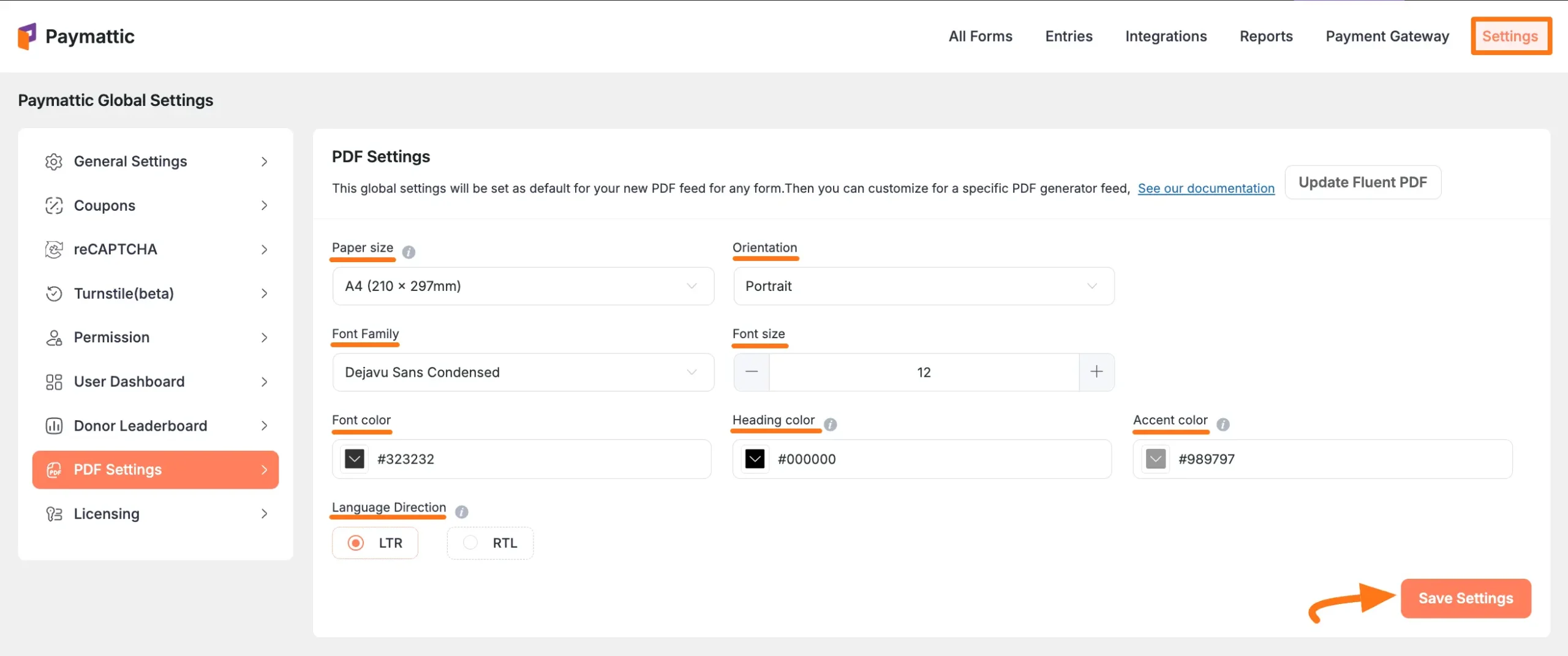 Once you install and activate Fluent PDF, return to the Settings from the Paymattic Navbar, open the PDF Settings tab from the left sidebar, and the PDF Settings page will appear.