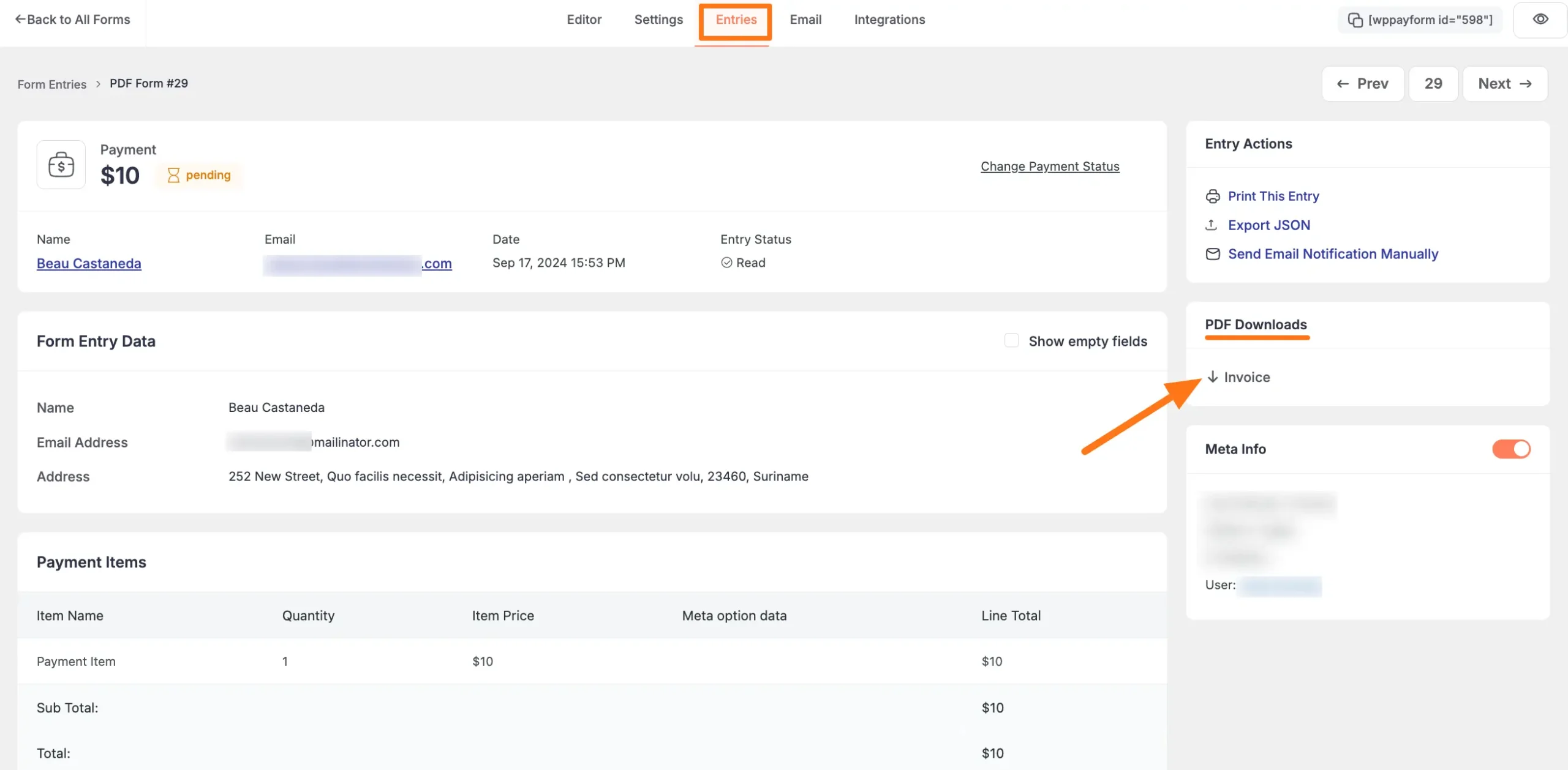 Once you have done customization and added the PDF Feed, go to the Entries section of the chosen form. Now, select any submission entry you wish to work on and click the View Details button of that entry.