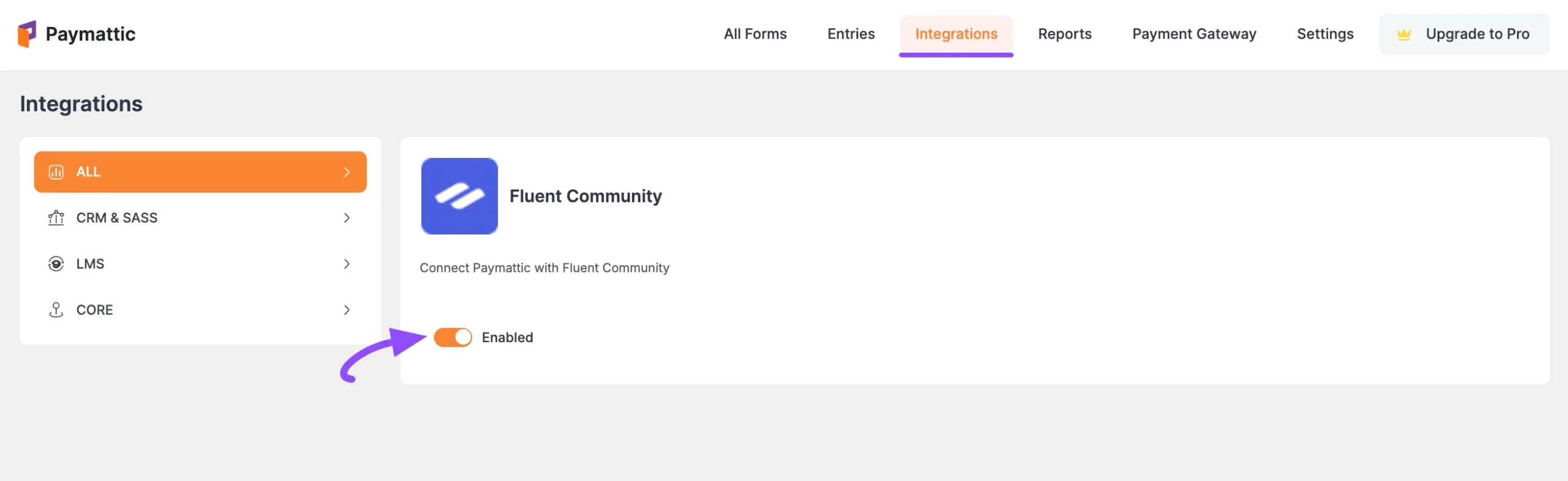 Before starting the process, you need to connect the FluentCommunity with Paymattic from the FluentCommunity Plugin.