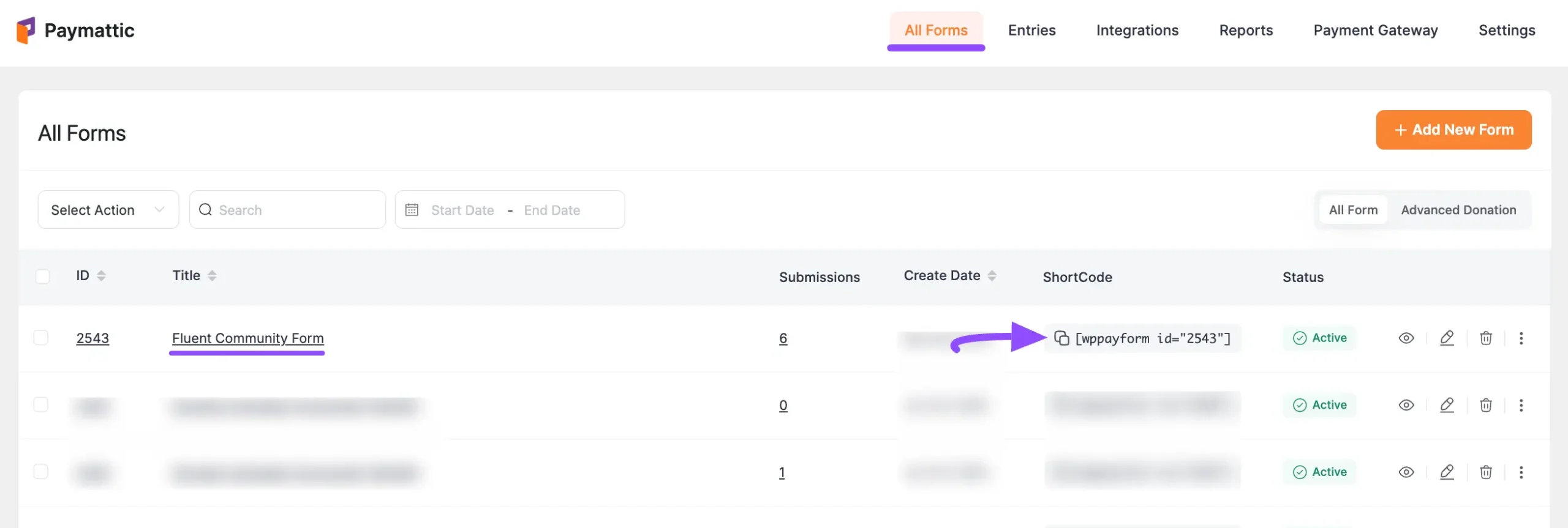 If you don't have any existing form, click the +Add New Form button to create a new one. To learn the detailed process of creating a new form to collect payments, read this Payment Form or Subscriptions Form documentation. For example, I used an existing payment form to show you the integration process.