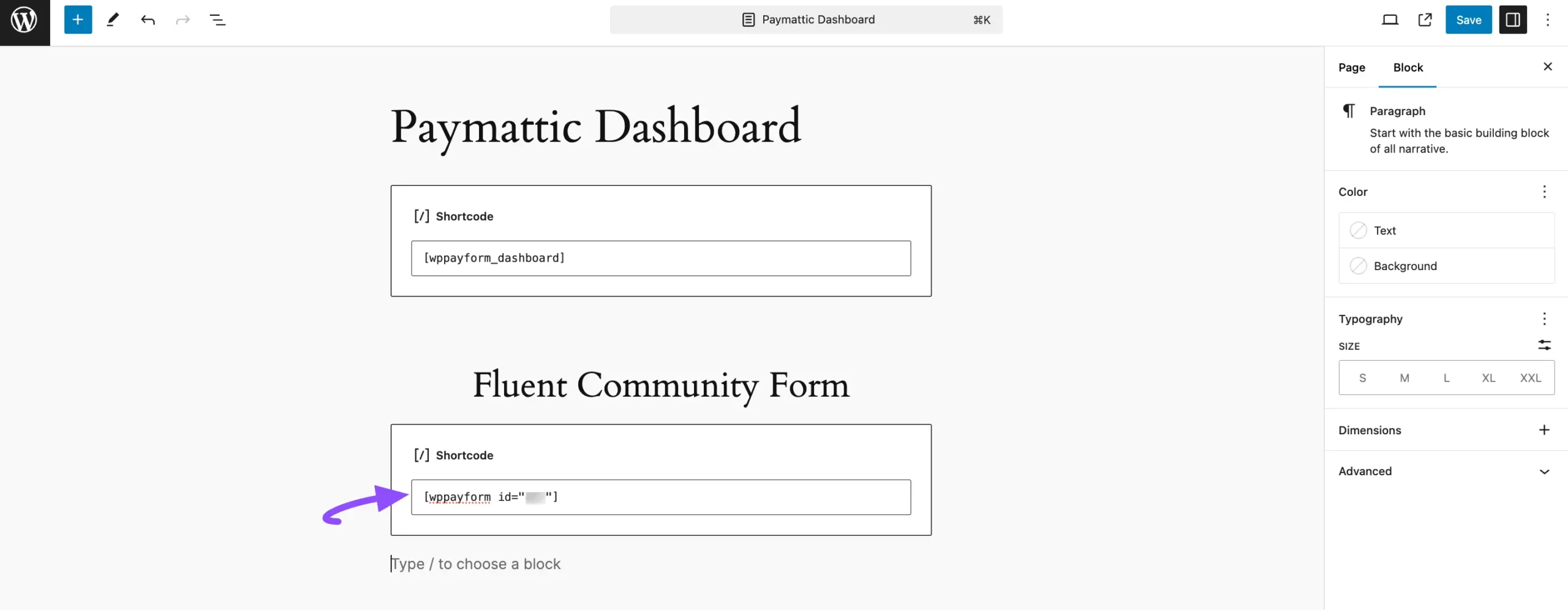 Then, paste the shortcode to the Page/Post where you want to display your FluentCommunity Form. For example, I pasted the ShortCode to the default Paymattic Dashboard Page.