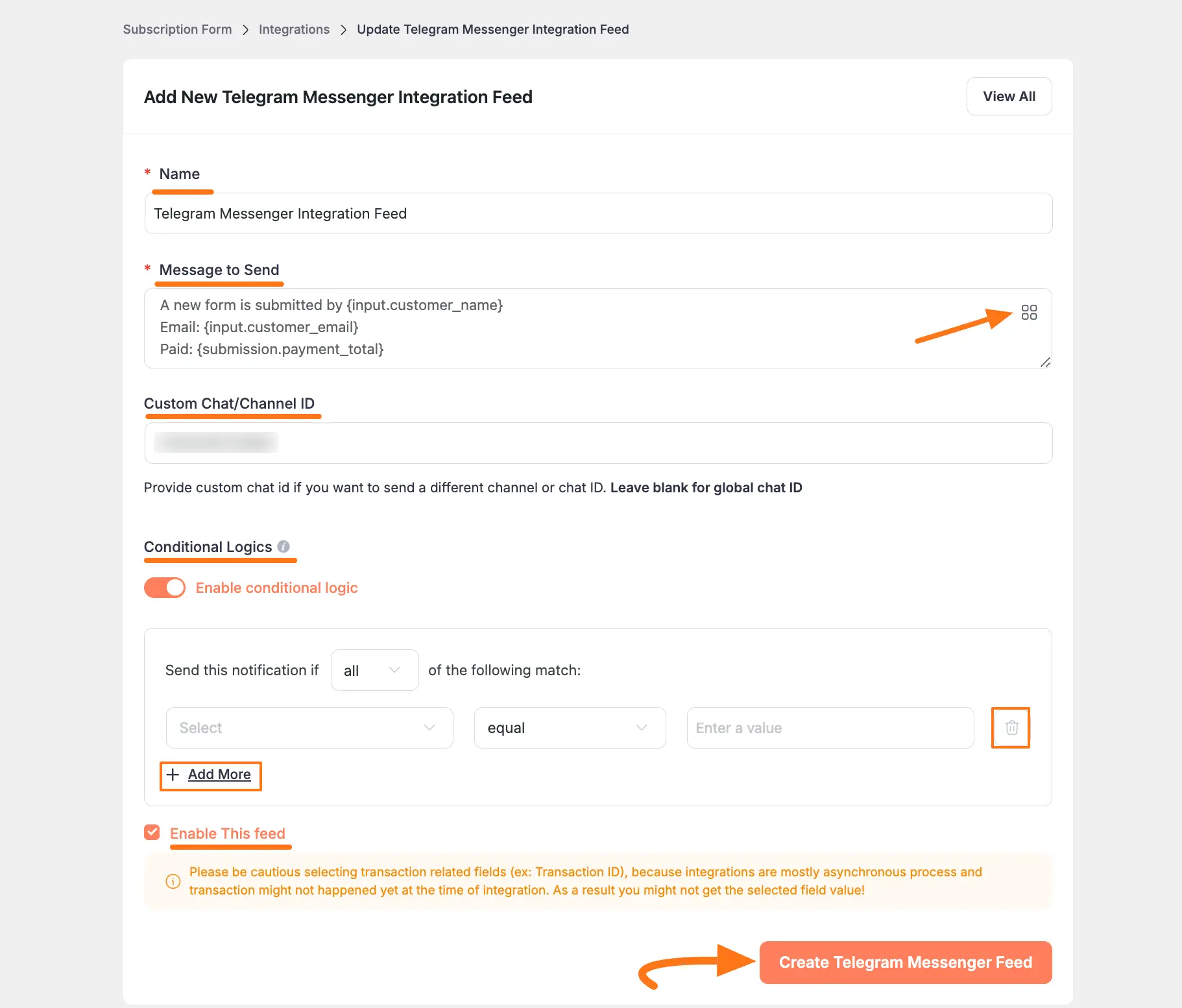 Once the setup is done, finally, click the Create Telegram Feed button. And, your Telegram will be integrated into this specific form!
