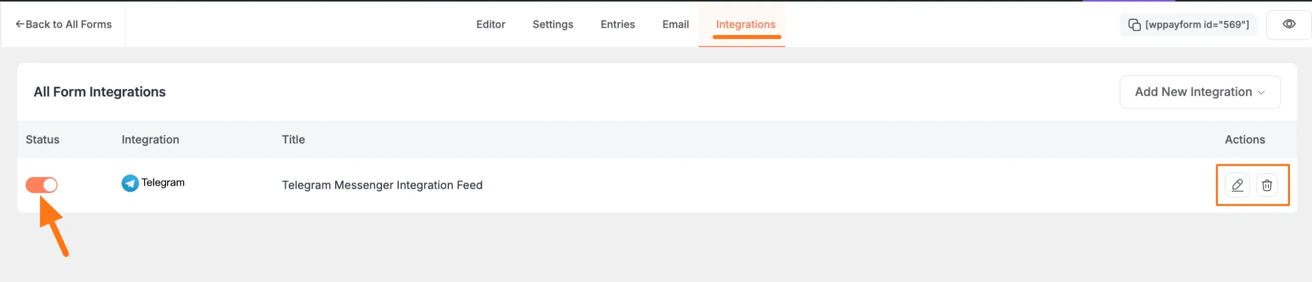 First, go to All Forms from the Paymattic Navbar, select the Desired Form where you want to integrate your Telegram, and click the Pencil/Editor Icon.