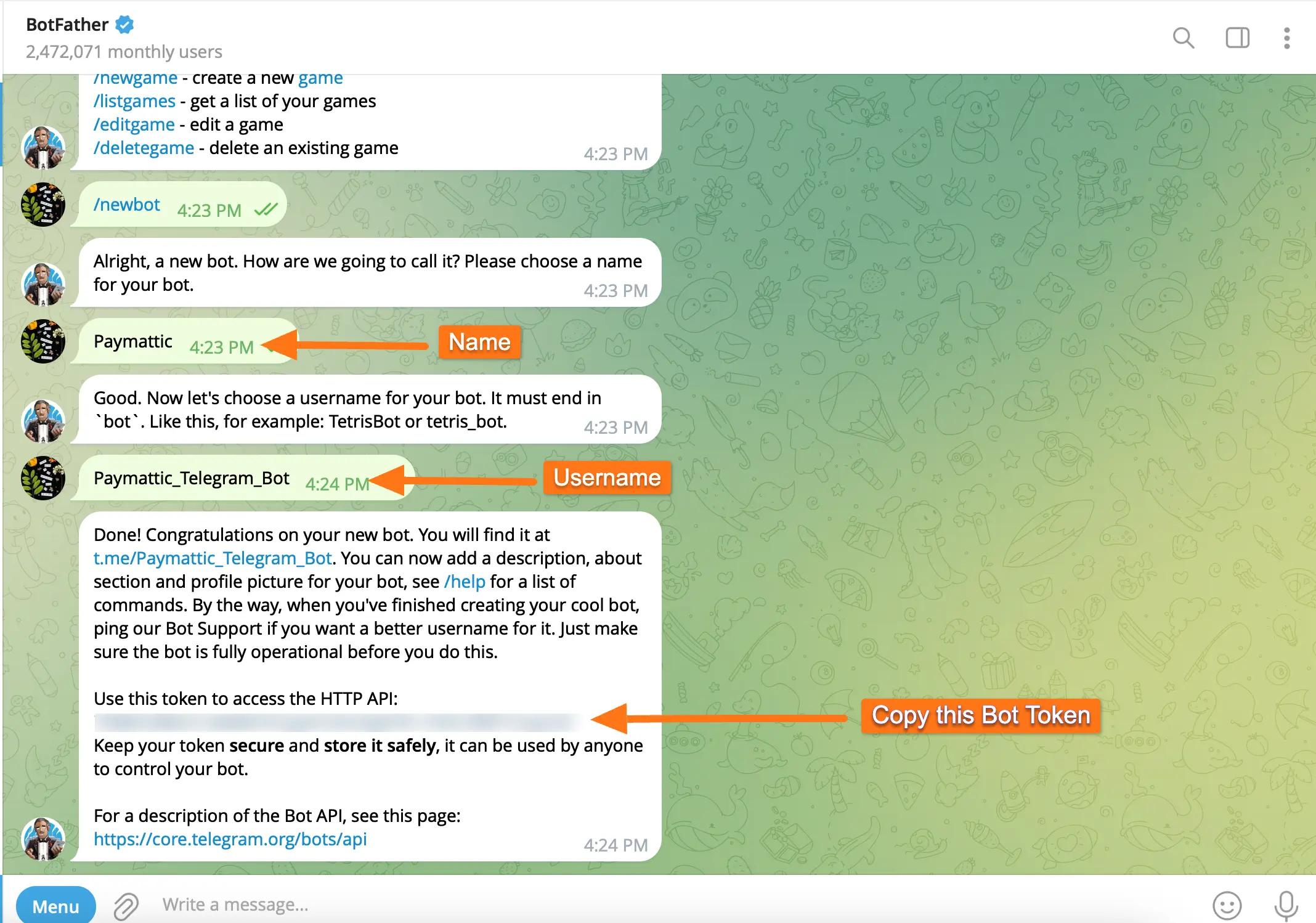 After finishing these steps, @BotFather will provide the Bot Token. Simply, copy it.