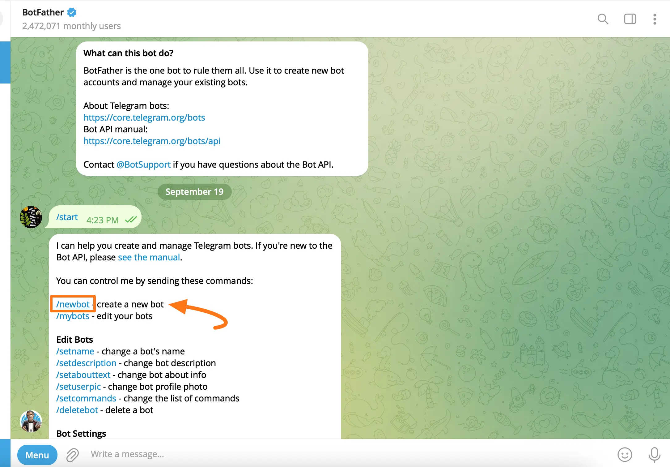 Then create a new bot by sending the ‘/newbot’ command using the help message.