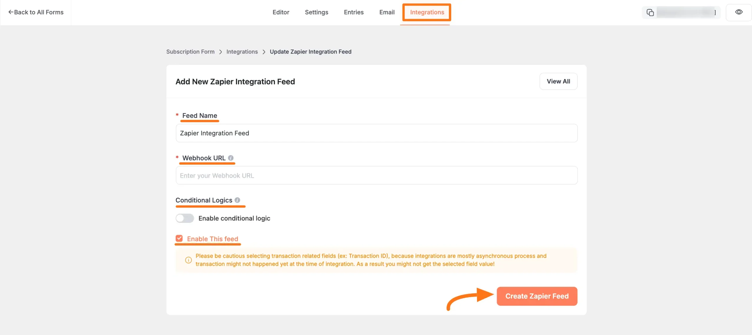 Now return to the Add New Zapier Integration Feed page from the Form’s Integration tab. And, paste the URL you copied from Zapier into the Webhook URL field.