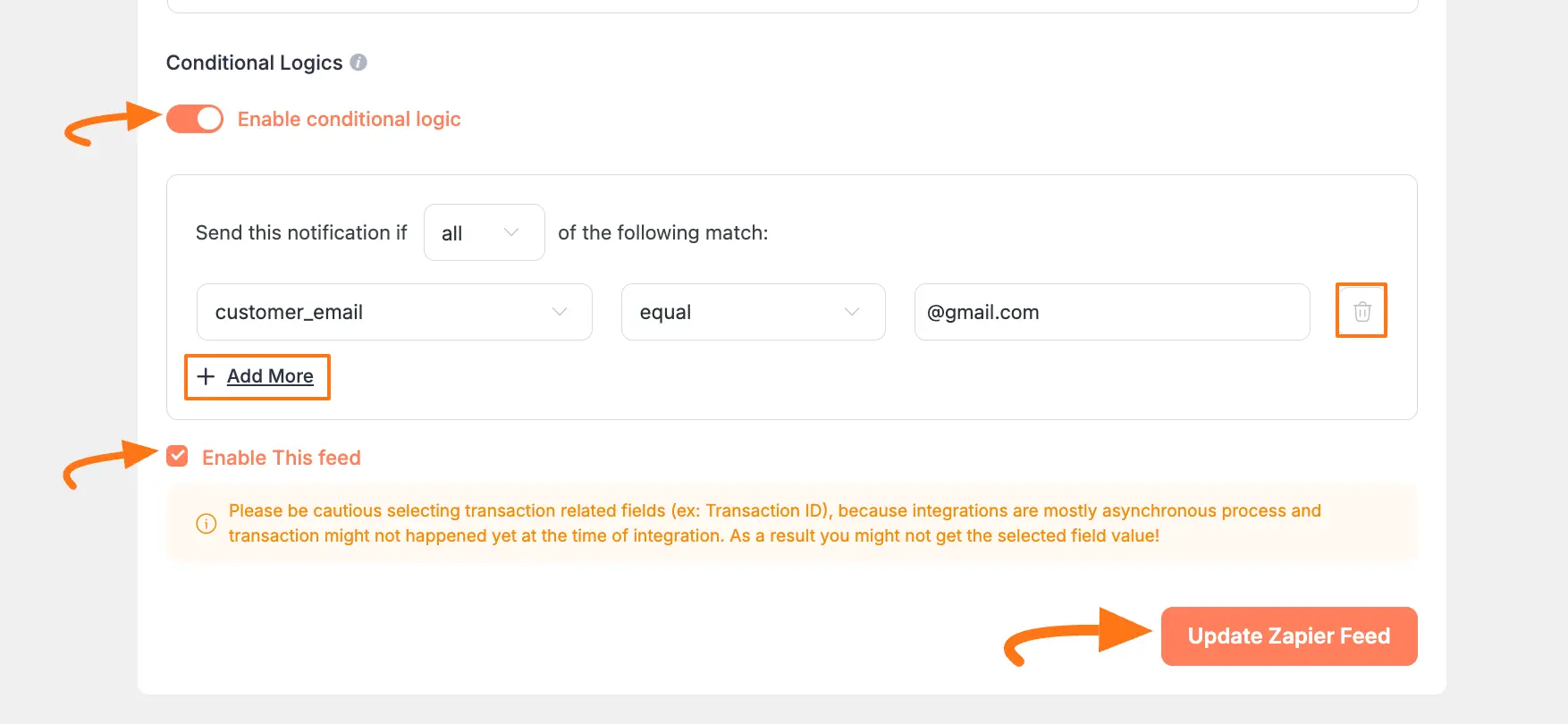 - Conditional Logics: Enabling this option by clicking the Toggle button allows Zapier integration to function conditionally based on your submission values according to your set conditional logic/s. Also, here, you can add as much conditional logic as you need by clicking the + Add More button and delete any logic by clicking the Trash Icon if needed.