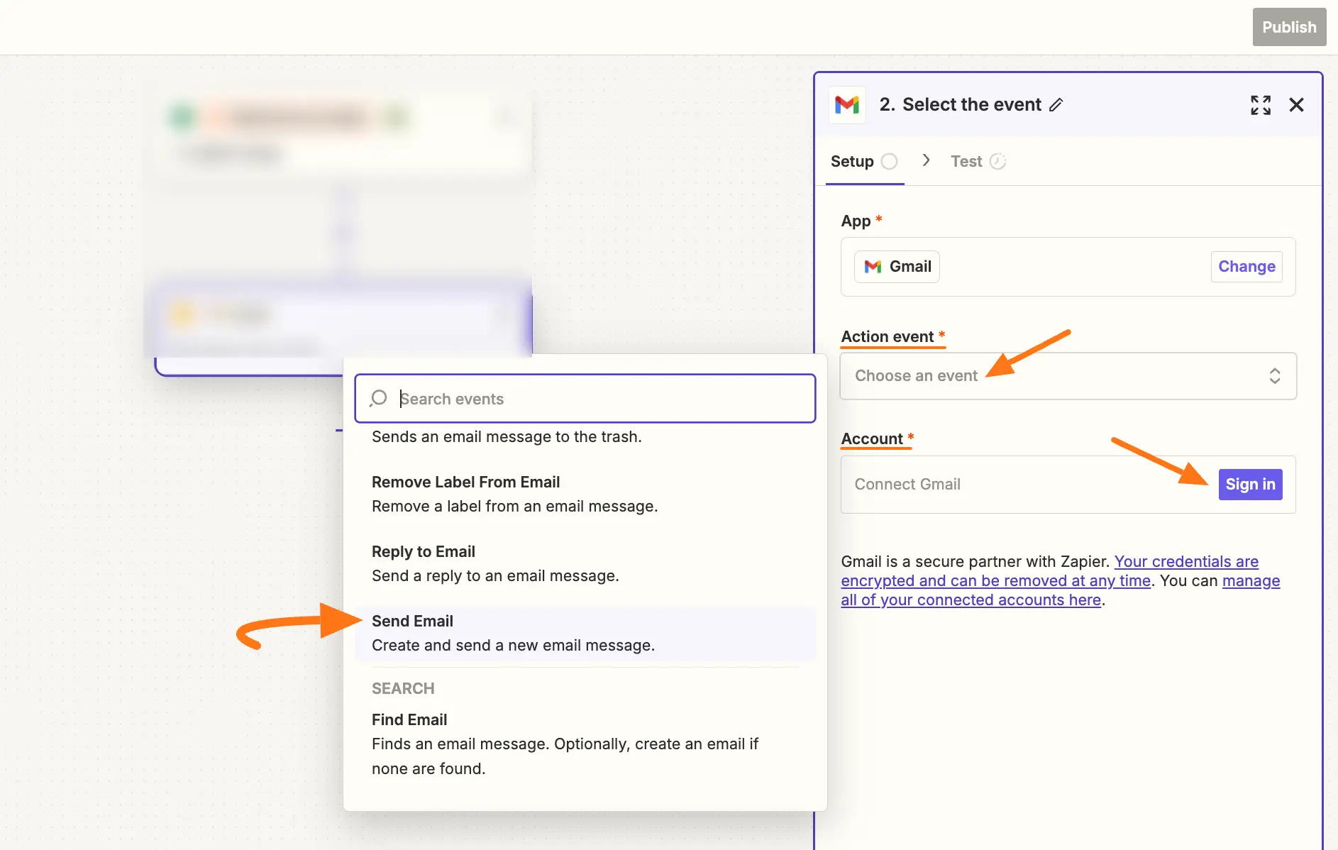 For example, I am selecting the Send Email option as an action event. Then, click the Sign in button to connect to your Gmail Account.