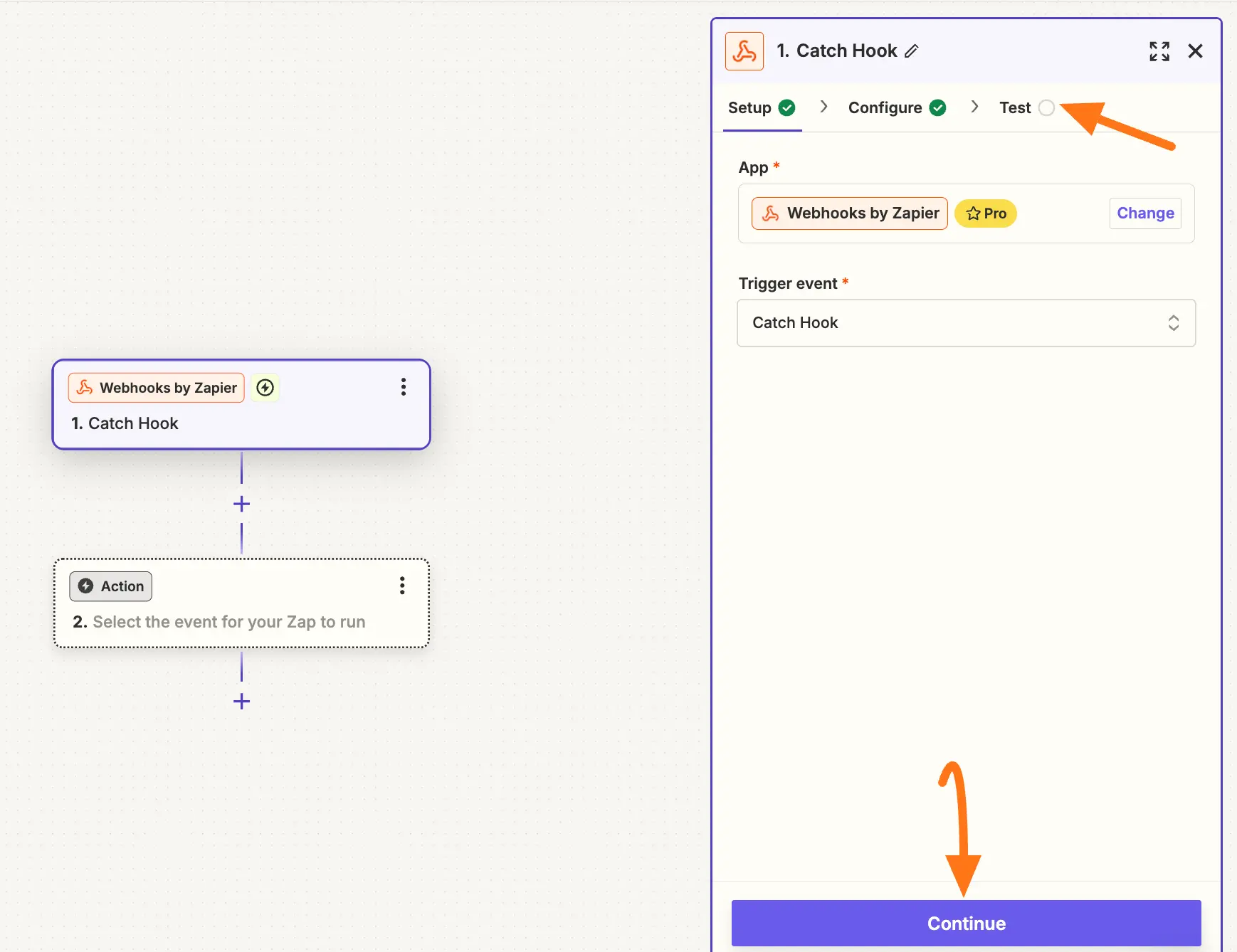 Click the Choose an event field and a pop-up will appear to select your Trigger event. Select Catch Hook as a trigger event.