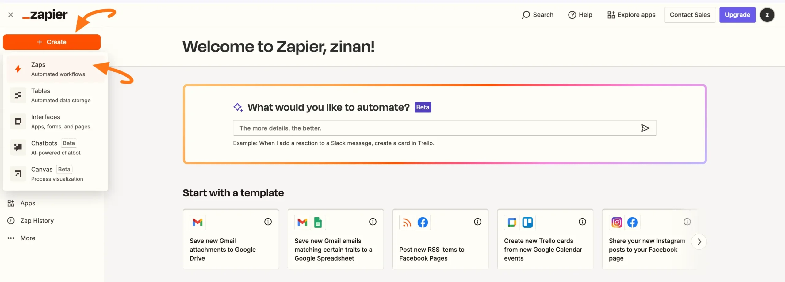 First. go to your Zapier account and log in to the dashboard. Now, click the + Create button and then click the Zaps button to create a new Zap.